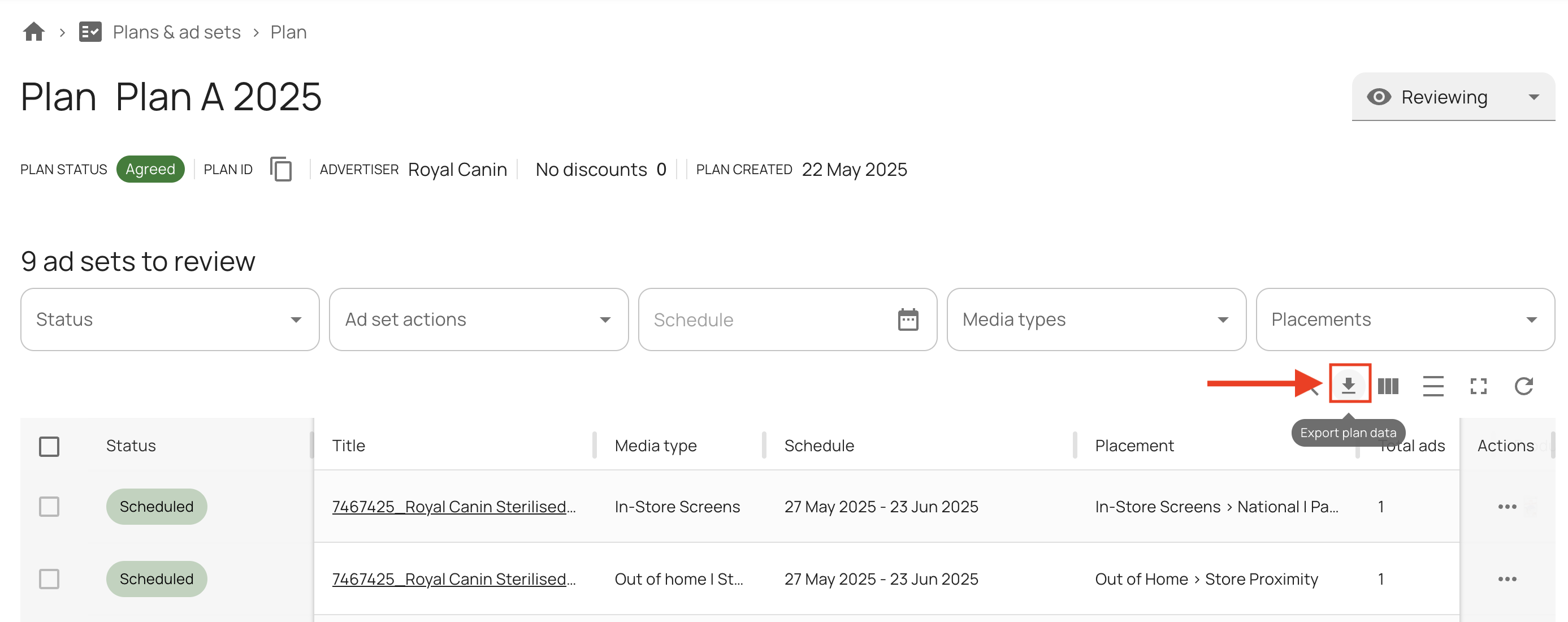 Users can now export all Ad Set details from a single Plan directly from the UI while in Review Mode. The export includes every Ad Set in the Plan, along with content from each Ad and Ad Set — such as Media Type, schedule, and custom field information.