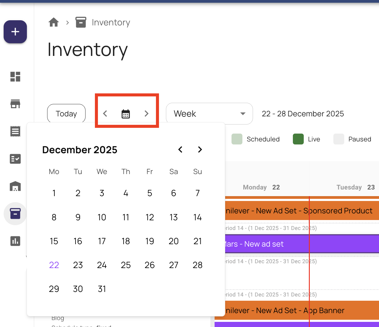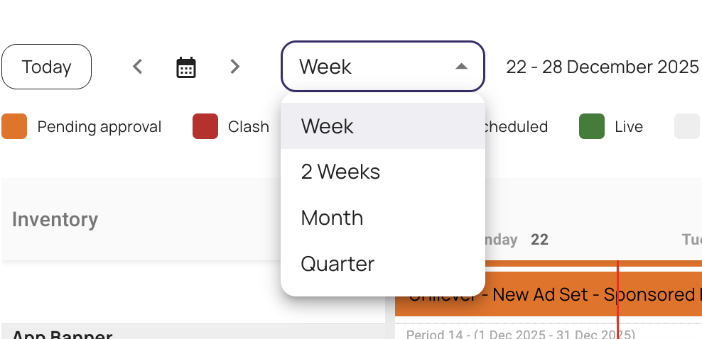 The Inventory View in Zitcha provides a centralised, calendar-based overview of all available media placements across your network.